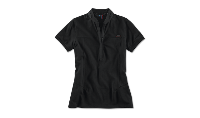 Elegant, fitted polo shirt with a stand-up collar, sophisticated seams and three-dimensional BMW M logo with a red background on the bust. The low hidden button strip underscores the elegant style. Imitation breast pocket, neck band with BMW M logo in glossy print.